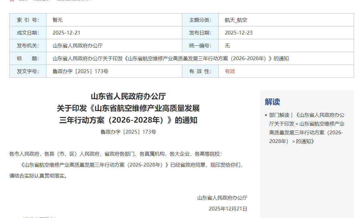 12月23日,山东省政府网站发布《山东省航空维修产业高质量发展三年行动方案(2026-2028年)》(以下简称“方案”),推动航空维修产业高质量发展,培育现代服务业发展新优势。