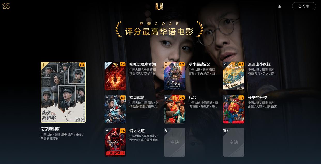 8.8分的《南京照相馆》登顶2025评分最高华语电影榜首,该片是申奥执导,刘昊然、王传君等主演的抗战胜利80周年献礼片,暑期档获得票房30.17亿元,观影人次超8500万。