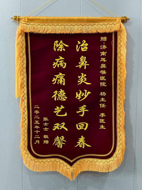 一面锦旗,一份认可;一声感谢,一份动力。在医患关系日益紧密的今天,这样的温情瞬间不断在济南耳鼻喉医院上演。医护人员用爱心、耐心和责任心守护患者健康,患者用理解与感谢回应这份付出,这份双向奔赴的温暖,也让医疗之路充满了人文关怀的光芒。
