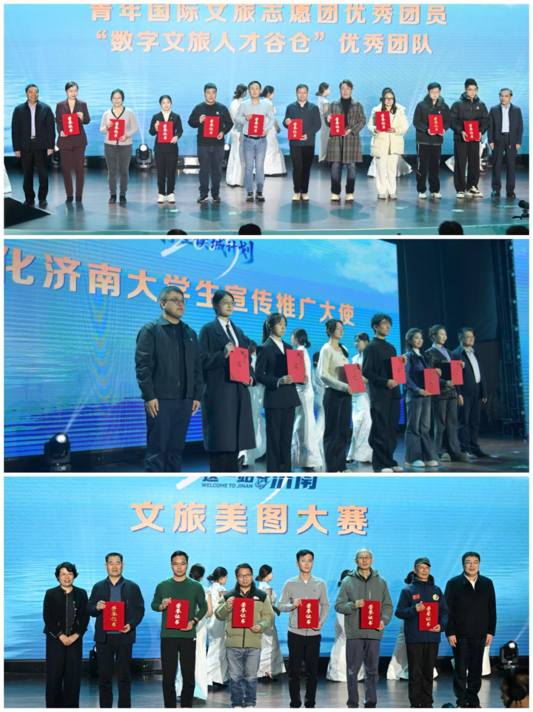 在活动现场,为“青年国际文旅志愿团优秀团员”、“数字文旅人才谷仓”优秀团队、“文化济南大学生宣传推广大使”、“这一站,济南”2025文旅美图大赛以及2025“大学生读城计划”突出贡献奖共计178名获奖个人和单位颁奖,激励他们在济南文旅国际传播、城市文旅形象宣传、数字赋能文旅应用等领域,继续注入鲜活的青春智慧,彰显青春力量对济南文旅发展的赋能价值。