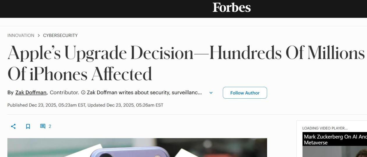 【环球网科技综合报道】12月24日消息,据forbes报道称,苹果公司近日加速推进其系统升级策略,要求所有iPhone 11及更新机型用户立即从iOS 18迁移至iOS 26,此举将直接影响全球数亿设备用户。这一决定源于近期确认的多起针对iPhone的高级持续性威胁(APT)攻击。
