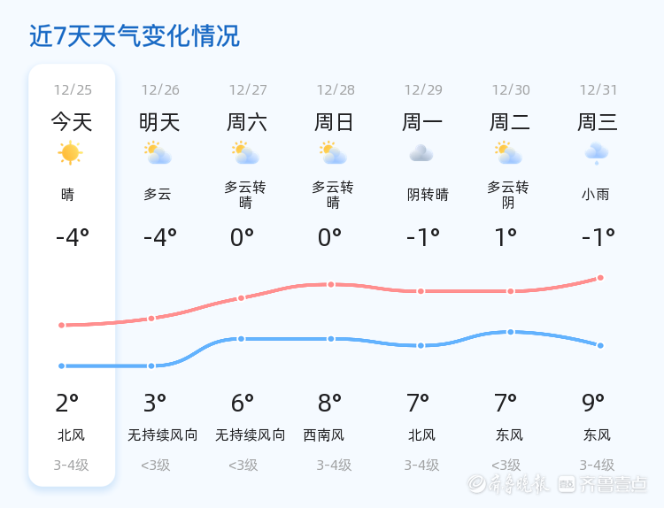 今天是12月25日,星期四,农历十一月初六。日照市今日天气晴朗,气温为0.7℃,西北风3级,空气湿度43%,PM2.5指数为45。全市各区气温普遍在-4℃到2℃之间,天气晴朗,适合户外活动。