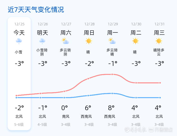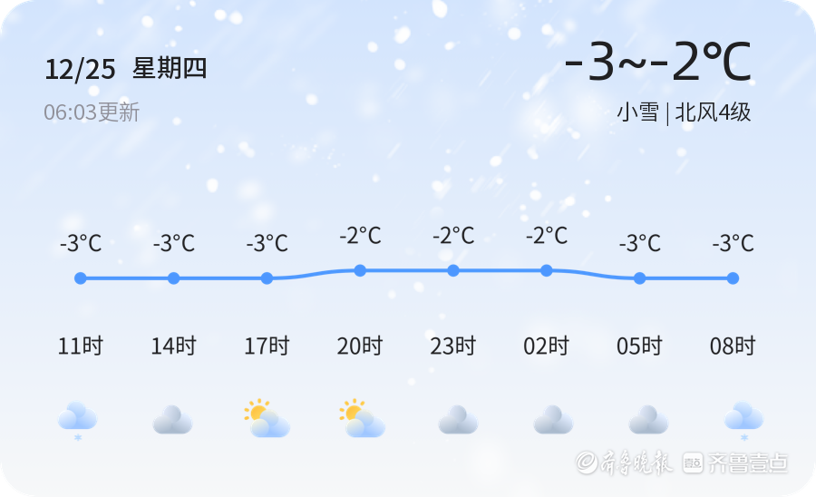 今天是12月25日,星期四,农历十一月初六。烟台市迎来小雪天气,全市范围内的气温普遍较低,最高气温为-2℃,最低气温为-3℃。目前气温为-1.7℃,北风4级,空气湿度为89%,PM2.5指数为28,空气质量良好。各区的天气情况基本一致,均以小雪为主,气温较低,出行需注意防寒保暖。