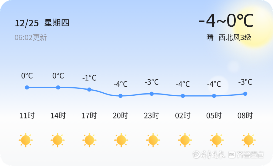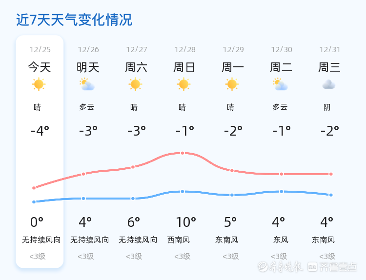 今天是12月25日,星期四,农历十一月初六。东营市天气晴朗,气温在-4℃至0℃之间,西北风3级,空气湿度41%,PM2.5指数为17,空气质量良好。各区天气情况一致,均为晴朗天气,适合市民户外活动。