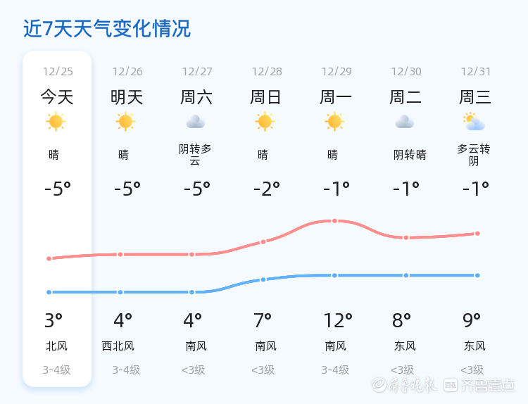 明天12月26日,枣庄市仍将保持晴朗天气,气温略有上升,最高气温可达4℃,最低气温维持在-5℃。风力稍有增强,为西北风3-4级,市民出行时需注意防风保暖。