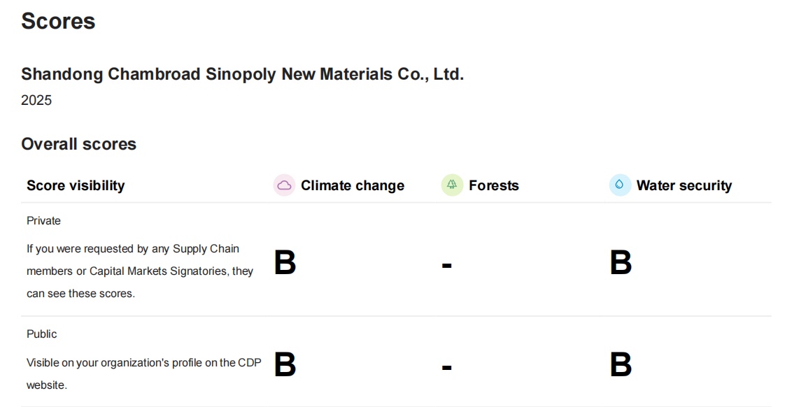 近日,全球环境信息披露平台(CDP)公布2025年度评级结果。山东京博中聚新材料有限公司在“气候变化”与“水安全”两项核心议题中均获“B”级评价,标志着其环境管理水平已获国际认可,并跻身行业绿色发展领先梯队。