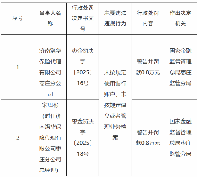 12月24日国家金融监督管理总局山东监管局官网公示的行政处罚决定书显示济南洛华保险代理有限公司枣庄分公司因未按规定使用银行账户未按规定建立或者管理业务档案被警告并罚款08万元同时宋思彬时任济南洛华保险代理有限公司枣庄分公司总经理被警告并罚款08万元
