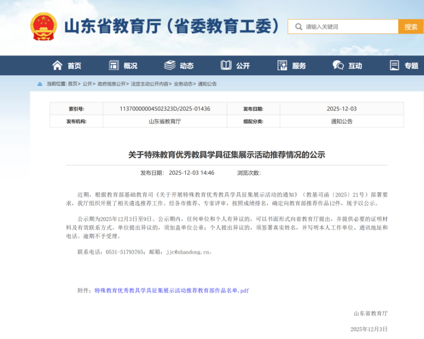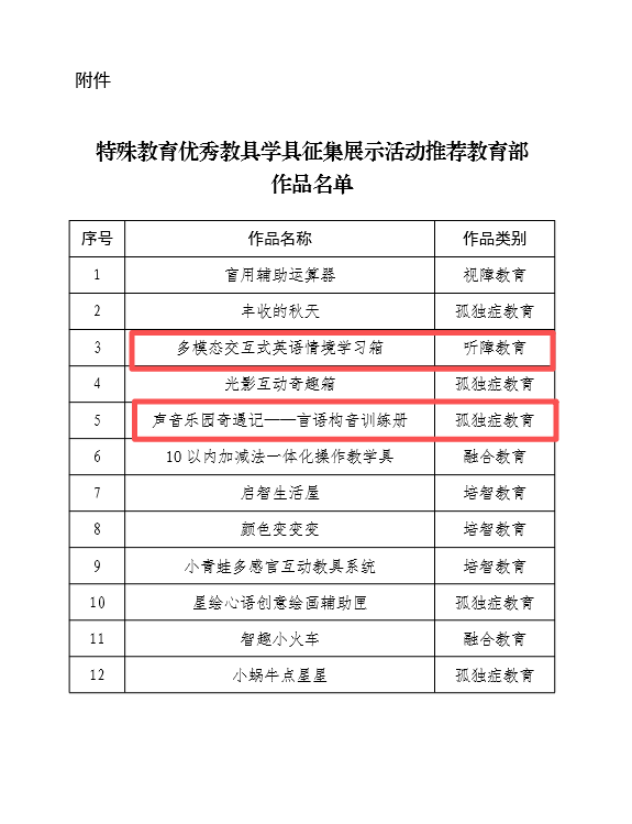 近日,山东省教育厅发布关于特殊教育优秀教具学具征集展示活动推荐情况的公示,淄博市“多模态交互式英语情境学习箱”、“声音乐园奇遇记——言语构音训练册”2个特殊教育优秀教具学具作品入选,入选数量占全省名额的1/6!前期,教育部办公厅公示第二届全国特殊教育教师教学基本功和融合教育典型案例征集结果,淄博市报送的《两小儿辩日》和《尊重差异 多元共融 让每一个生命精彩绽放》2个案例成功入选,占全省推荐名额的1/8,充分展现了淄博市特殊教育工作的创新成果和示范引领作用。