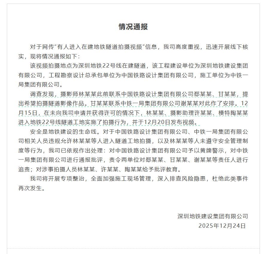 安全是地铁建设的生命线。对于中国铁路设计集团有限公司、中铁一局集团有限公司相关人员违规允许林某某等人进入隧道工地拍摄,以及林某某等人未遵守安全管理制度等行为,我司已依规作出处理:对中国铁路设计集团有限公司予以黄牌警示,对中铁一局集团有限公司进行通报批评,责令两单位对郄某某、甘某某、谢某某等责任人进行追责;对涉事拍摄人员林某某、许某某、陶某某给予批评教育。