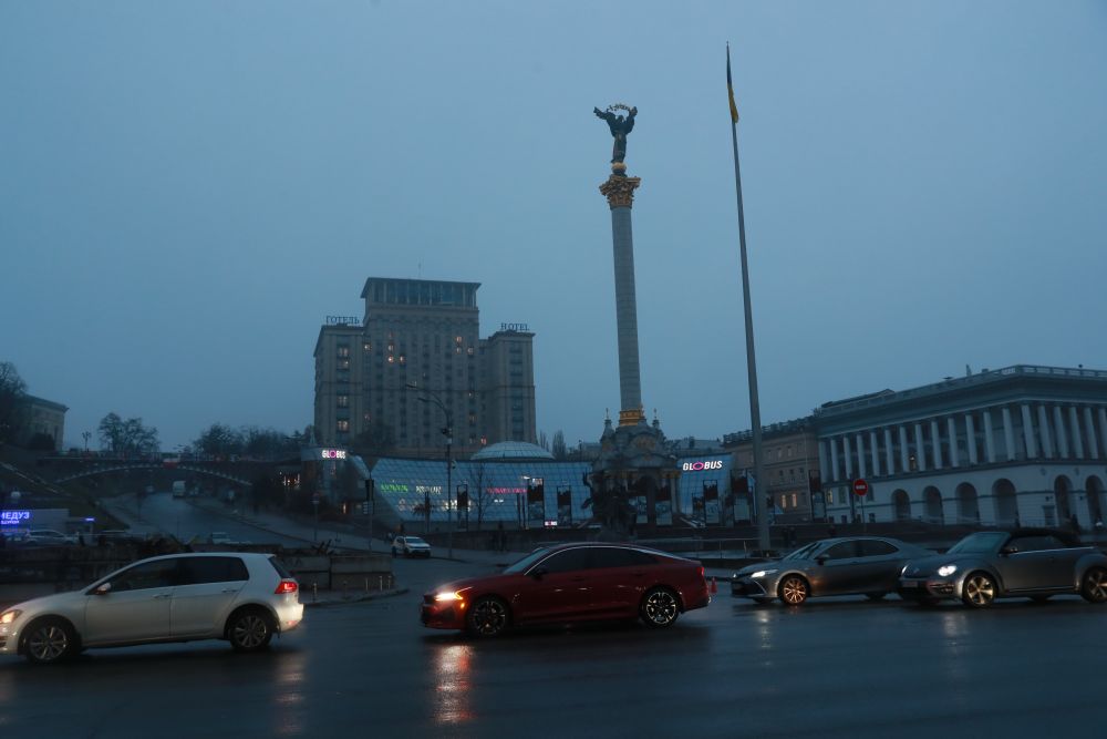 2025年11月20日,因俄乌冲突,乌克兰首都基辅主要街道的照明设施出现大面积停电,车辆在暮色中驶过独立广场。新华社