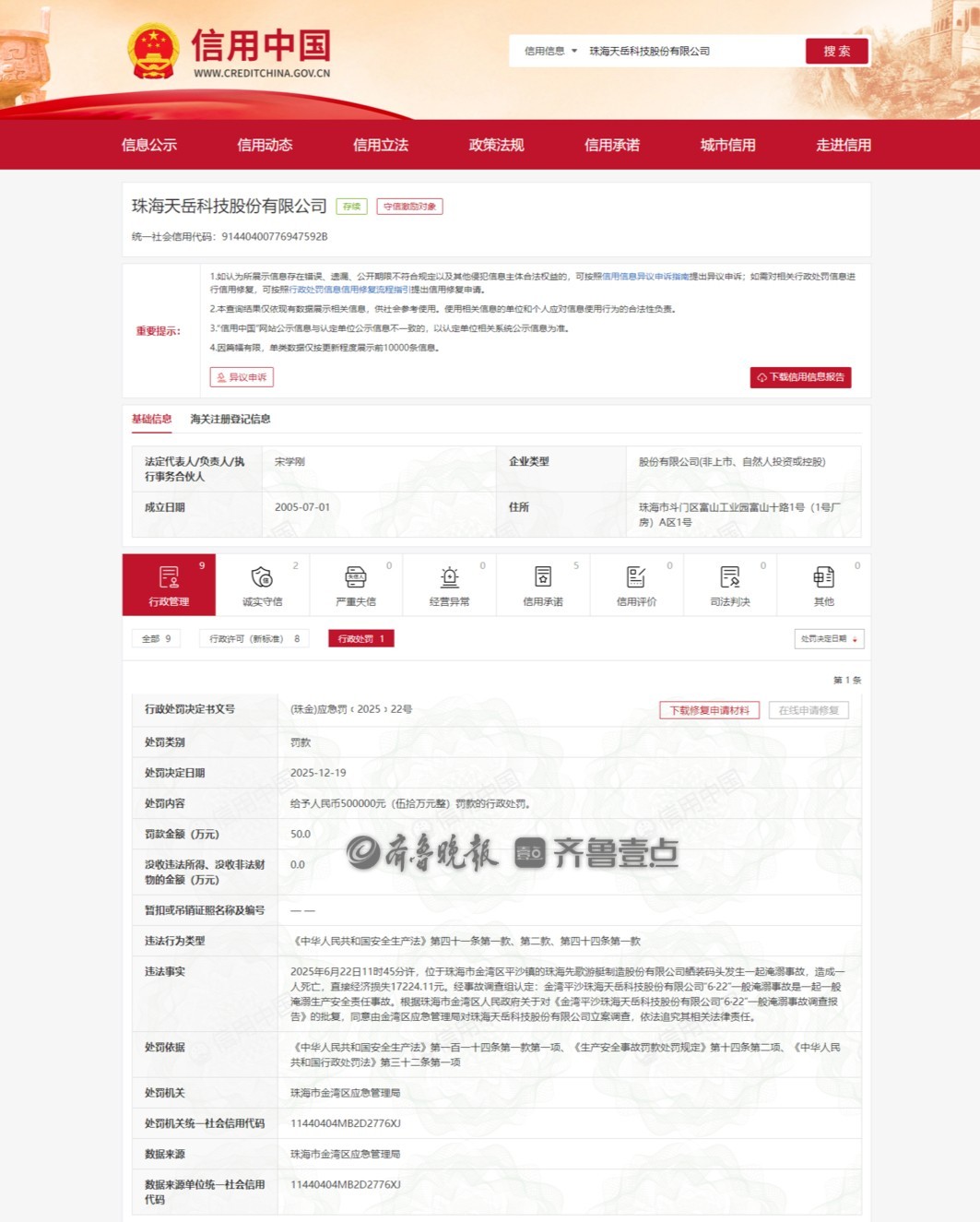 近日,珠海市金湾区应急管理局依法对珠海天岳科技股份有限公司作出行政处罚,罚款人民币50万元整。相关行政处罚决定书文号为(珠金)应急罚﹝2025﹞22号。
