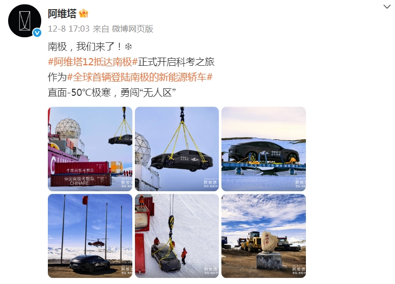 近日,阿维塔官方微博发布消息称,旗下车型阿维塔12已抵达南极中山站,完成-50℃极寒环境测试。