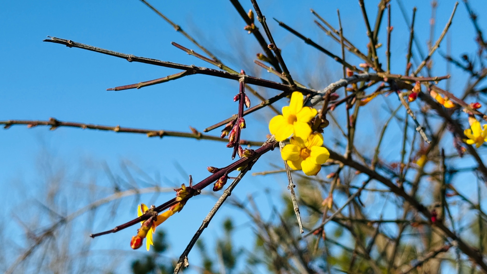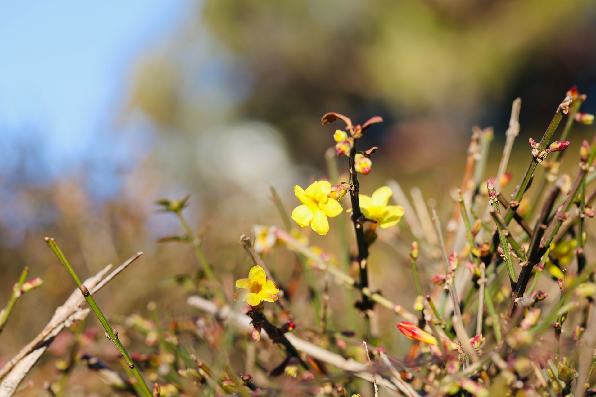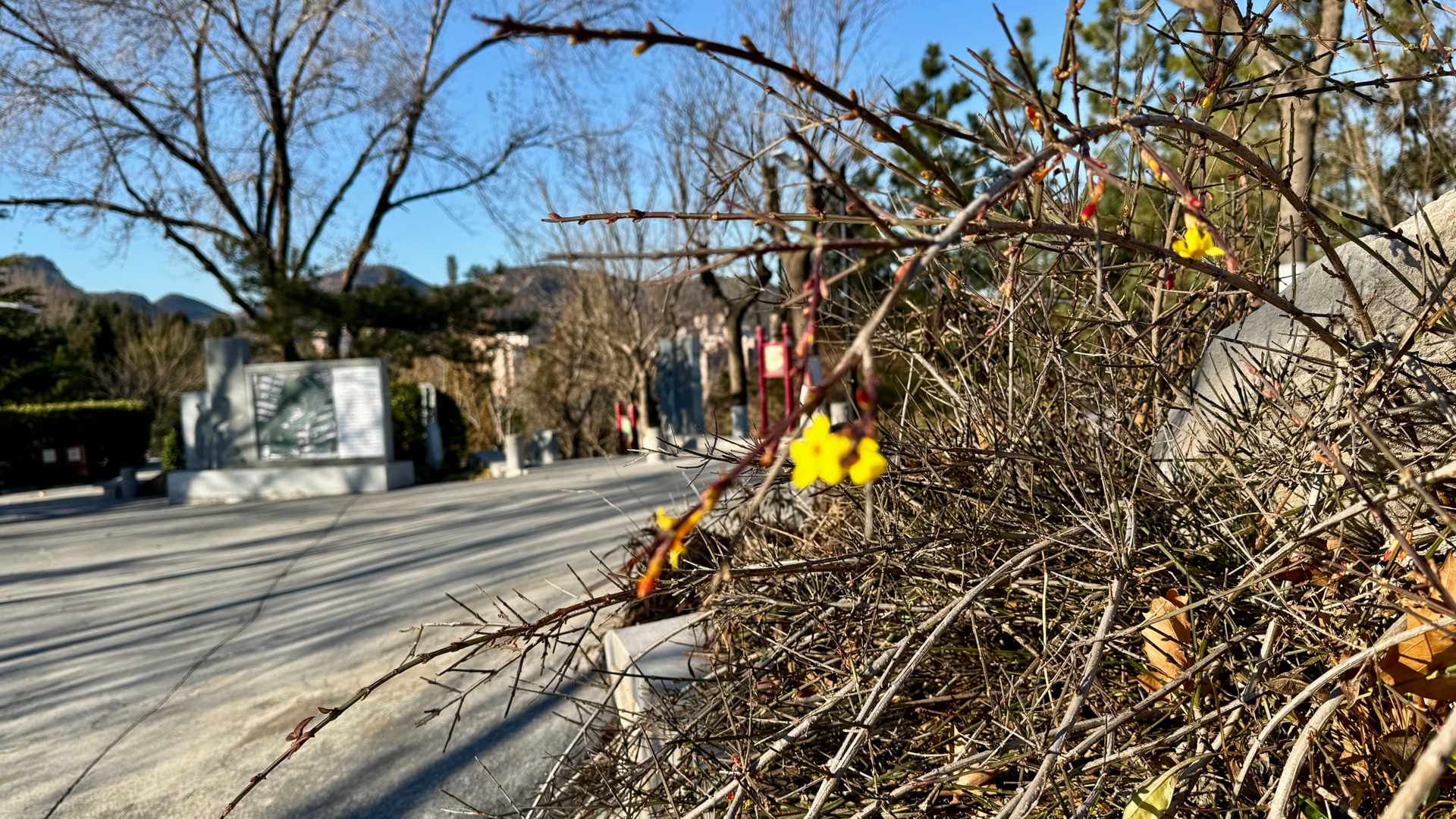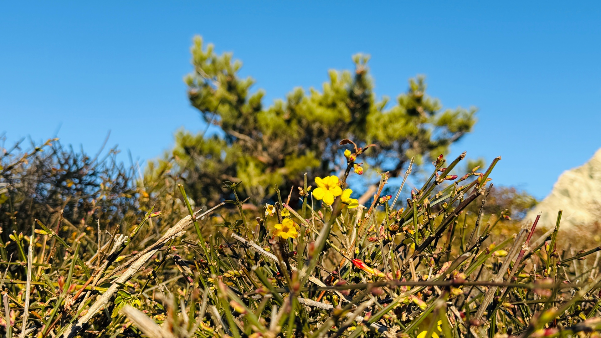 12月25日寒冬时节济南市历下区洪山公园大洪山山头迎春花陆续开放尤其是近几日来虽然山上相对寒冷但越来越多的迎春花先后盛开从先前的星星点点直至现在的三五成群吸引了周边小区的众多居民登山围观大众新闻记者武宗义
