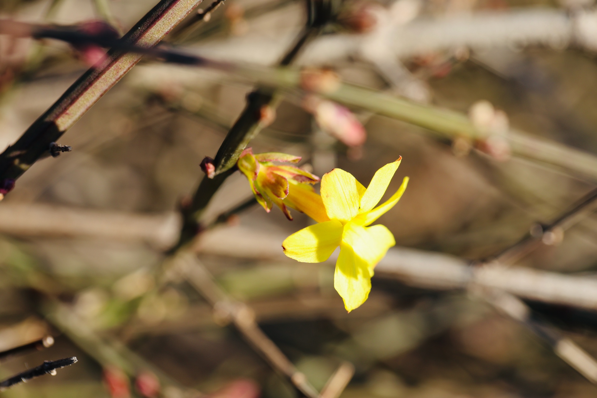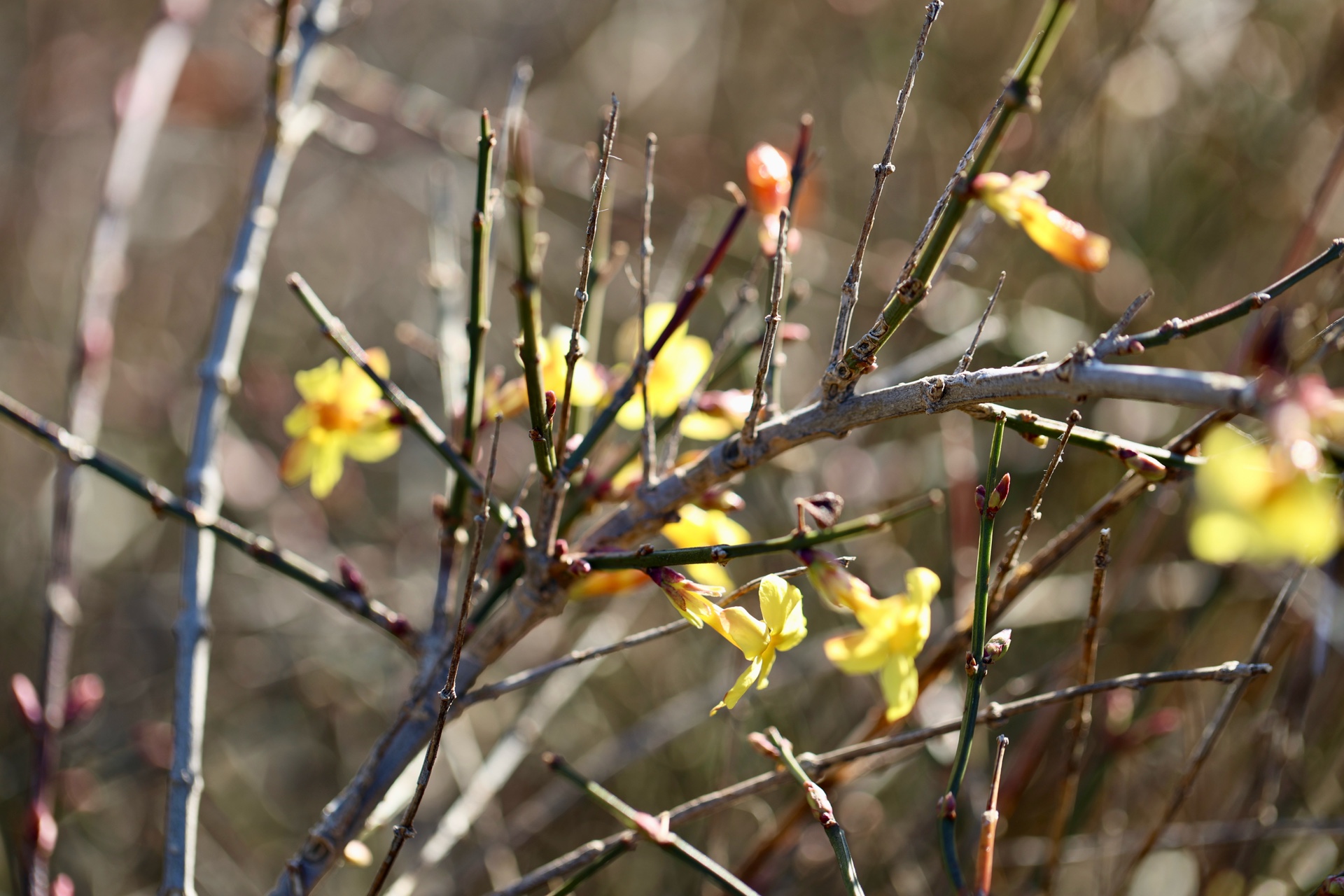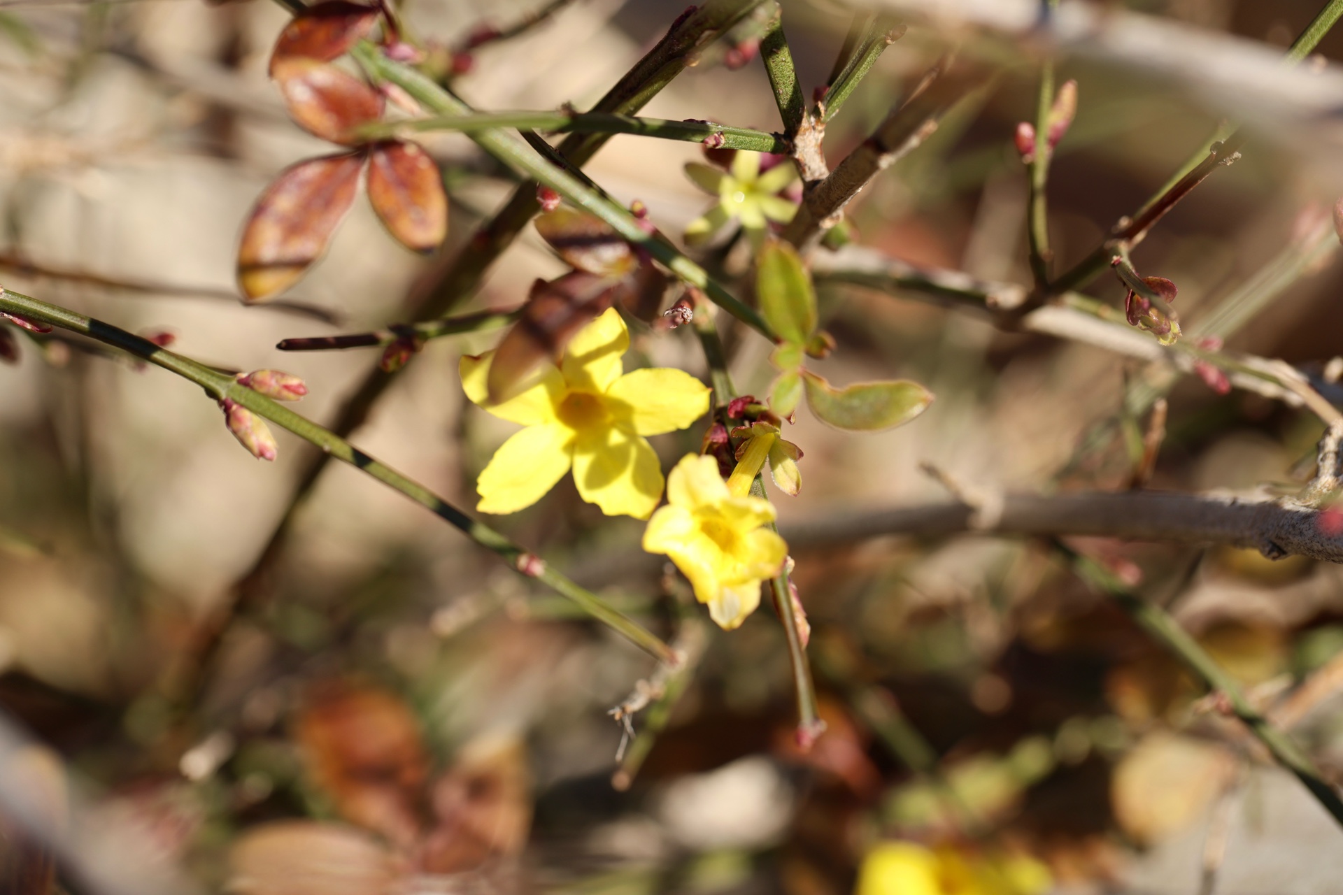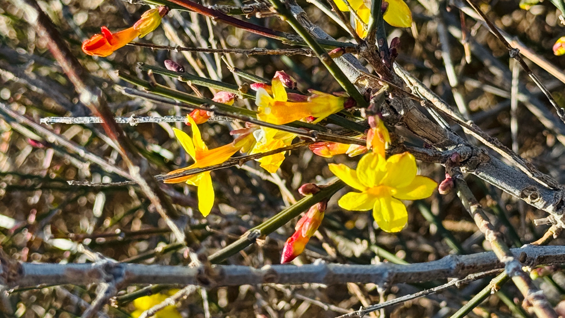 12月25日寒冬时节济南市历下区洪山公园大洪山山头迎春花陆续开放尤其是近几日来虽然山上相对寒冷但越来越多的迎春花先后盛开从先前的星星点点直至现在的三五成群吸引了周边小区的众多居民登山围观大众新闻记者武宗义