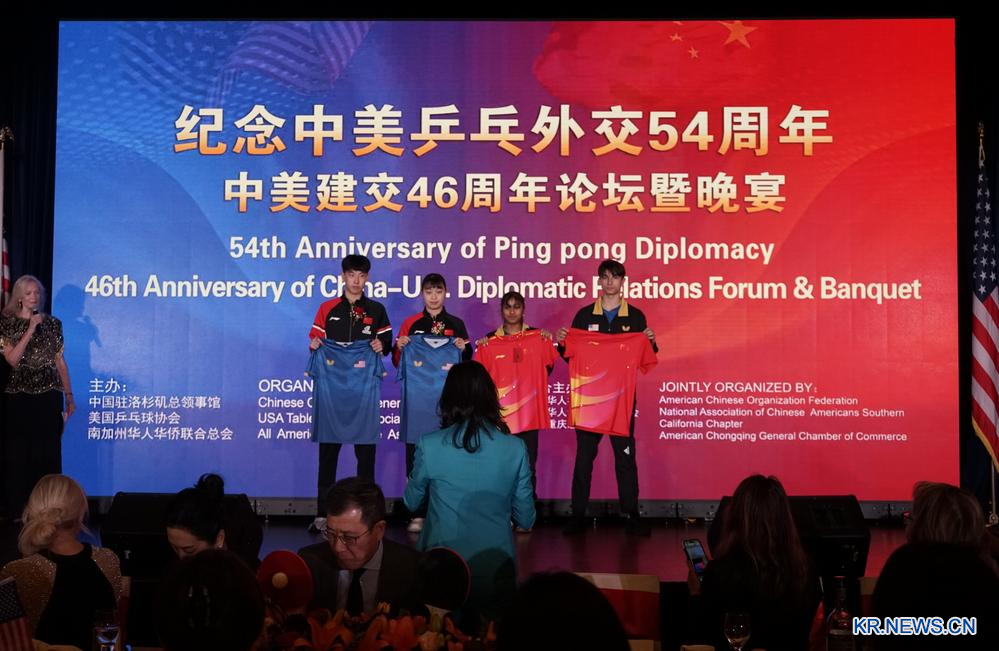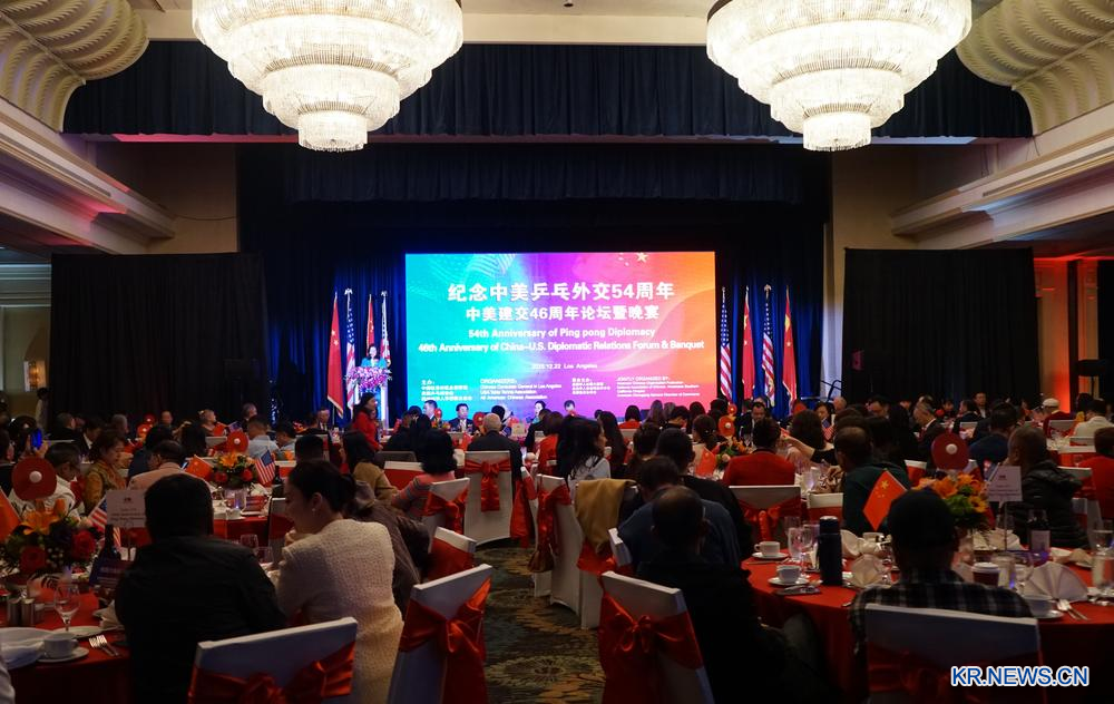 [신화망 로스앤젤레스 12월25일] '중·미 핑퐁 외교 54주년, 중·미 수교 46주년 기념 포럼 및 만찬'이 지난 22일 미국 캘리포니아주 로스앤젤레스에서 열렸다. 이번 행사에는 양국 체육계, 정·재계 등 수백 명의 인사가 참석했다.