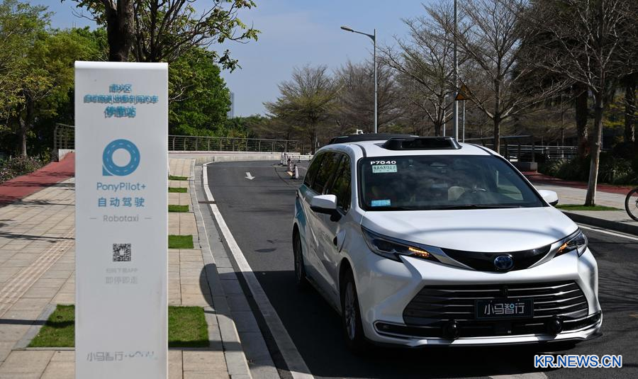 3월 11일 광둥(廣東)성 광저우(廣州)시 난사(南沙)구 승강장에 정차 중인 샤오마즈싱(小馬智行·Pony.ai) 로보택시. (사진/신화통신)