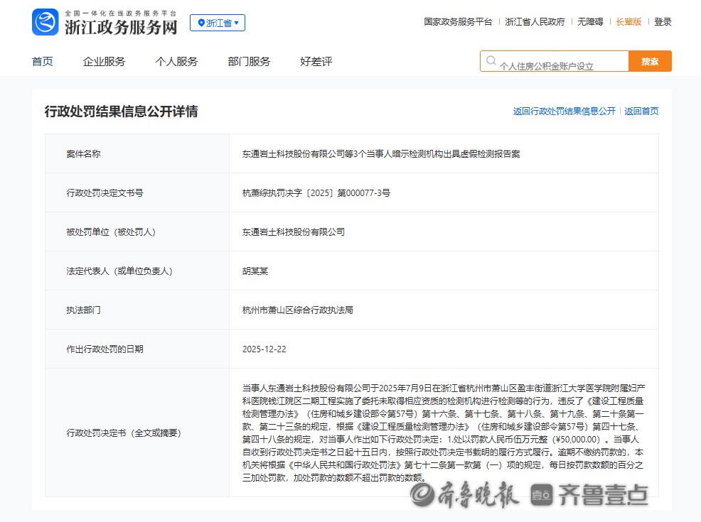 近日,齐鲁晚报·齐鲁壹点记者从浙江政务服务网获悉,东通岩土科技股份有限公司(东通岩土 874444)因暗示检测机构出具虚假检测报告案,被杭州市萧山区综合行政执法局罚款5万元。