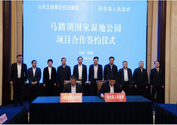 近日,山东文旅景区集团与桓台县人民政府在淄博市举行马踏湖国家湿地公园项目合作签约仪式。淄博市委副书记、市长赵庆文,市政府党组成员、副市长郭庆,市政府秘书长宗志坚,桓台县委书记范伟,县委副书记、县长王洪波,山东文旅集团党委书记、董事长丁艺,党委委员、副总经理乔卫东出席签约仪式。