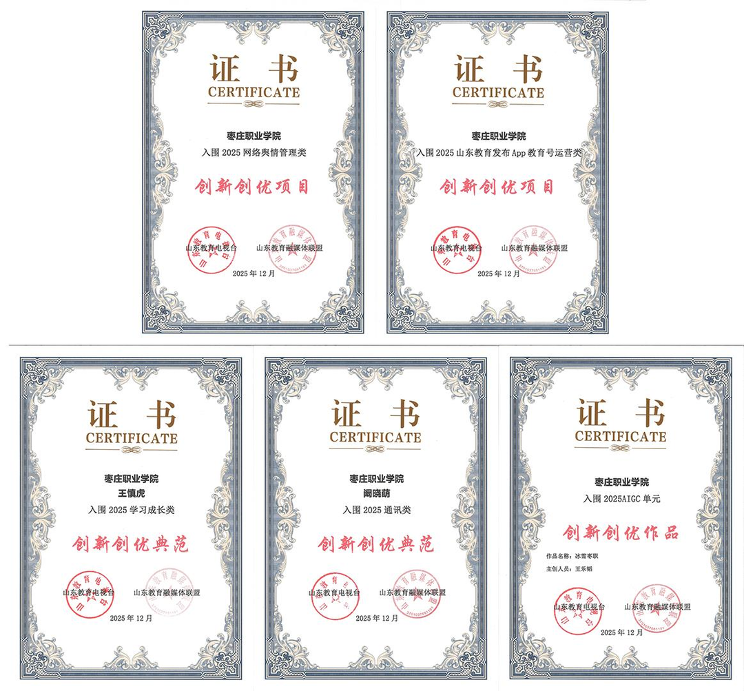 本次评选中,枣庄职业学院入围“2025网络舆情管理类创新创优项目”“2025山东教育发布App教育号运营类创新创优项目”;作品《冰雪枣职》入围“2025 AIGC单元创新创优作品”;王慎虎、阚晓萌两位教师分别荣获“学习成长类”“通讯类”创新创优典范奖。这也是继“枣职融媒”获评2025年度“好网民·在枣庄”正能量社团后,学院在融媒体品牌建设与内容创新方面取得的又一重要成果。