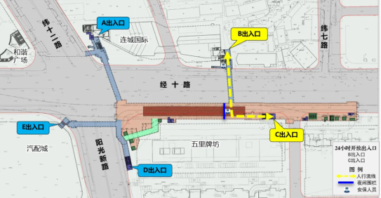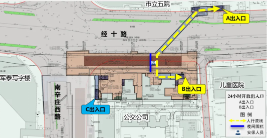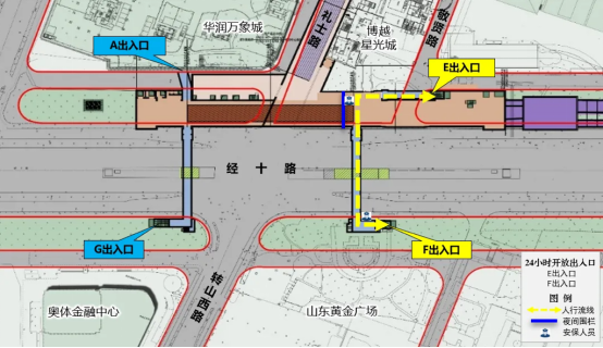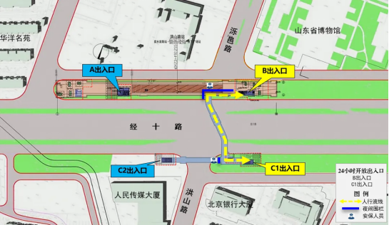 济南轨道交通4号线开通后,允许行人无需购票进站,即可免费通过地铁站通道安全过街。经十路沿线26座车站在运营时段内开放过街功能;营市街、五里牌坊、山东博物馆、转山西路(万象城)、奥体中心及第一医科大学在内的6座车站,提供全天候过街服务。