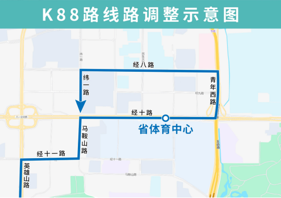 K88路优化调整后由仲宫开往省体育中心,沿马鞍山路向北、经十路向东、青年西路向北、经八路向西、纬一路向南至马鞍山路向南恢复原线。