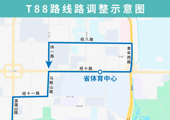 T88路优化调整后由仲宫开往省体育中心,沿马鞍山路向北、经十路向东、青年西路向北、经八路向西、纬一路向南至马鞍山路向南恢复原线。