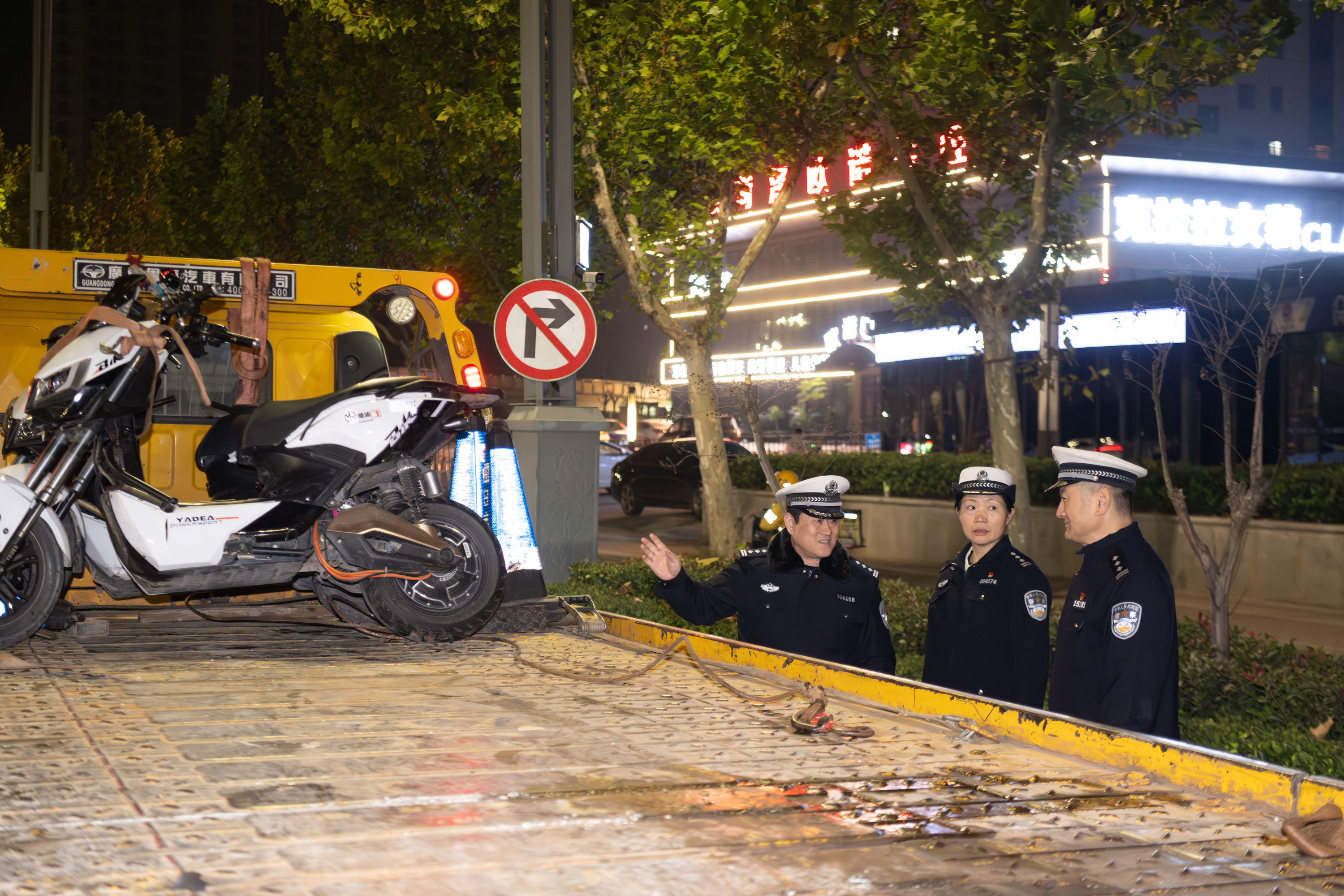 夜色中,交警执法人员在重点路段设卡检查,对过往电摩逐一排查,重点查验车辆是否存在改装动力、加装灯光、更改排气等违规行为。行动中,执法人员发现多辆涉嫌非法改装的电摩,现场依法对违规车辆实施拖移扣留,并对驾驶人进行交通安全教育,明确非法改装车辆上路行驶的安全隐患与法律后果。