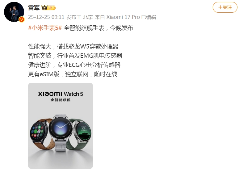 12月25日,雷军在微博发文宣布,小米手表5将于今晚发布,新款手表搭载专业ECG心电分析传感器,此次还将发布eSIM版,独立联网,随时在线。