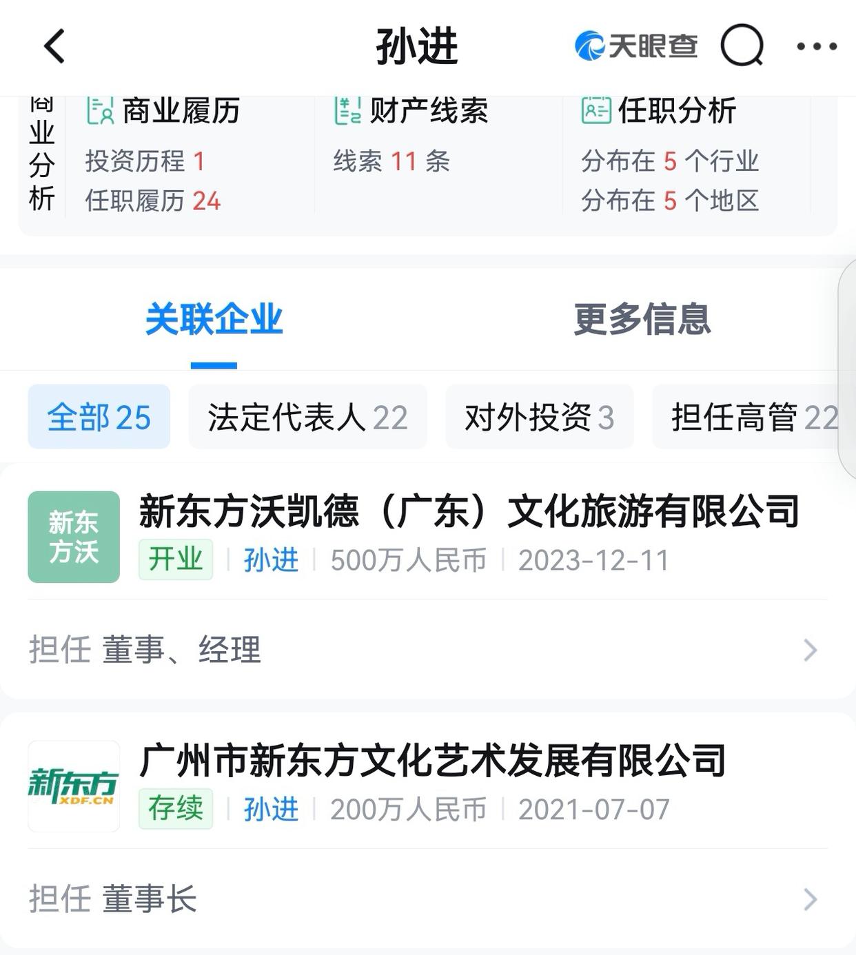 天眼查App显示,目前孙进担任广州市新东方文化艺术发展有限公司法定代表人、董事长,还在新东方沃凯德(广东)文化旅游有限公司担任法定代表人、董事、经理等职务。
