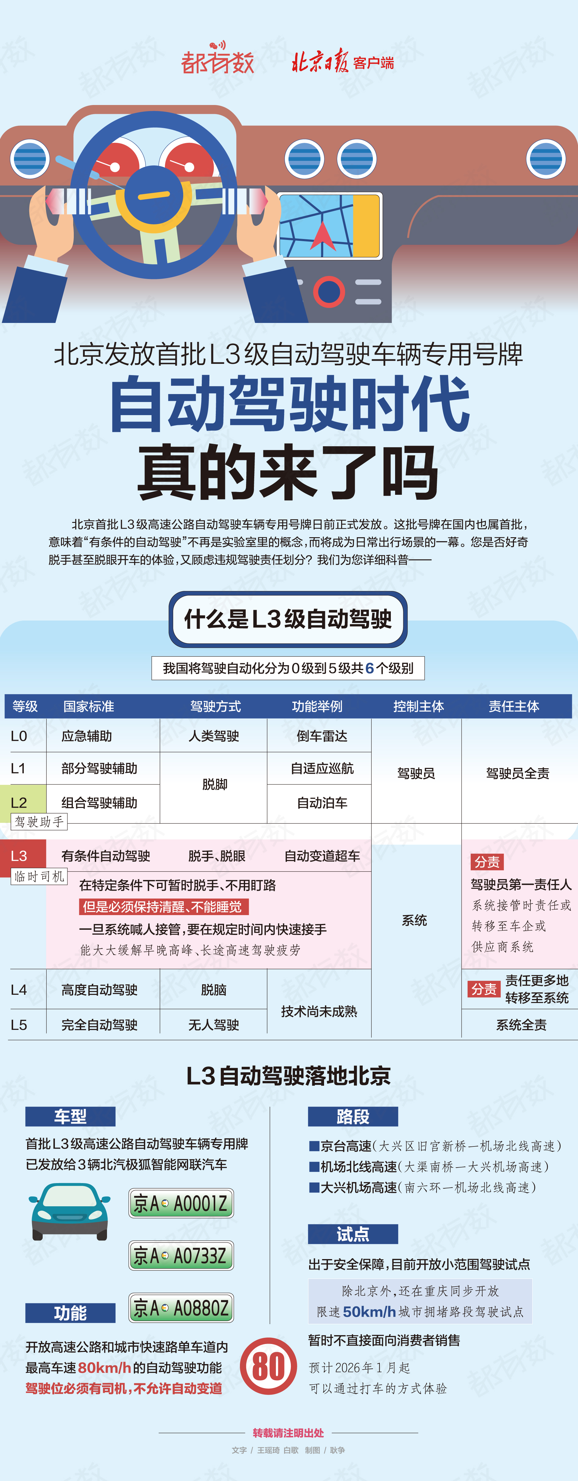 北京首批L3级高速公路自动驾驶车辆专用号牌日前正式发放这批号牌在国内也属首批意味着有条件的自动驾驶不再是实验室里的概念而将成为日常出行场景的一幕您是否好奇脱手甚至脱眼开车的体验又顾虑违规驾驶责任划分我们为您详细科普