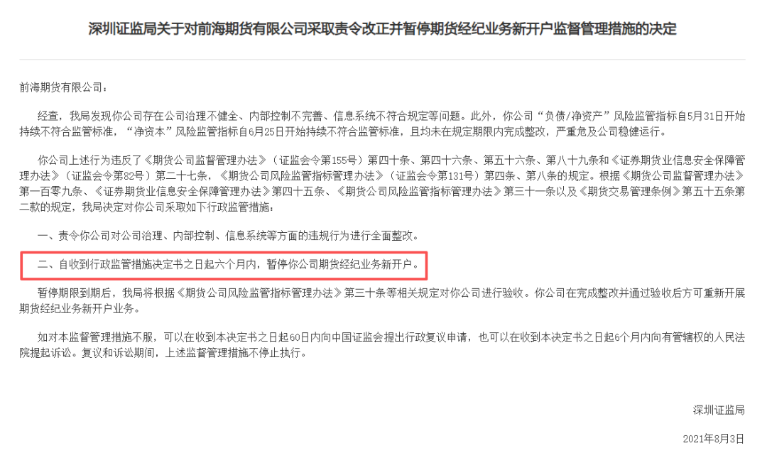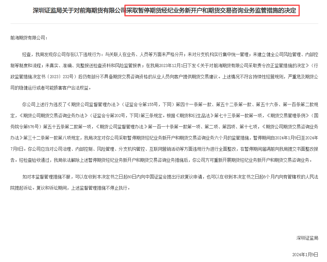 记者查询发现,前海期货还因为公司治理不健全、内控不完善、风险指标不合格、与关联人在业务、人员方面未严格分开等问题,分别于2021年8月、2024年1月被深圳监管局暂停期货经纪业务新开户和期货交易咨询业务六个月。尤其在2024年的处罚中,深圳监管局就明确指出前海期货存在未对分公司实行集中统一管理、未真实、准确、完整报送检查资料和风险监管报表的违规行为。