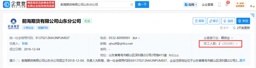 前海期货山东分公司成立于2018年,注册地址为青岛市崂山区。2024年9月14日,公司负责人由高增猛变更为耿敬。不过,值得注意的是,企查查显示,2022年、2023年、2024年,公司员工人数分别为3人、3人、2人。