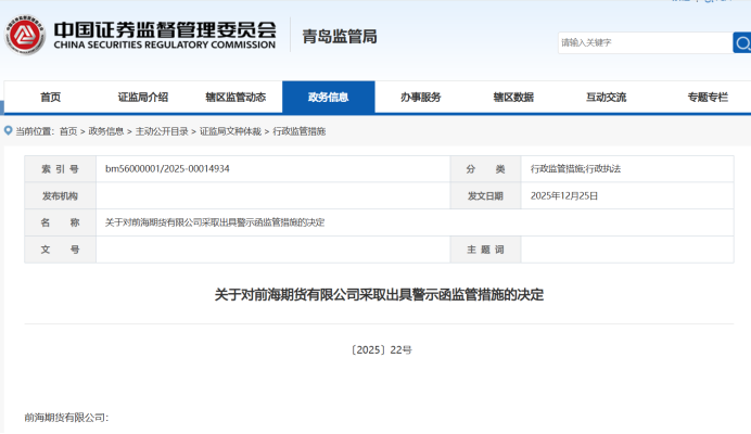 12月25日,证监会青岛监管局官网公示的行政监管措施决定书显示,前海期货有限公司因两项违法违规被采取出具警示函监管措施的决定。
