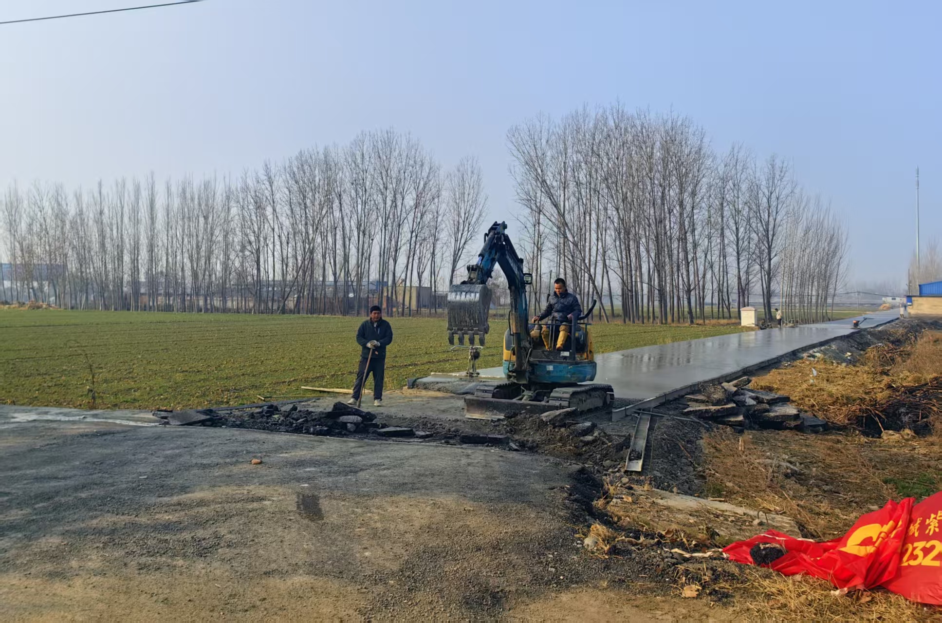 村主干道海棠路一侧,施工人员正在紧锣密鼓进行路面平整与维护作业。“这条路连接付庄村和马庙村,长约750米,是两村往来的主要通道。”施工人员介绍,“目前道路施工已进入收尾阶段,今日即可完工,晾晒几天后便能正常通行。路面宽5米,采用C30灰混凝土铺装,厚度达18公分,硬化标准很高。”