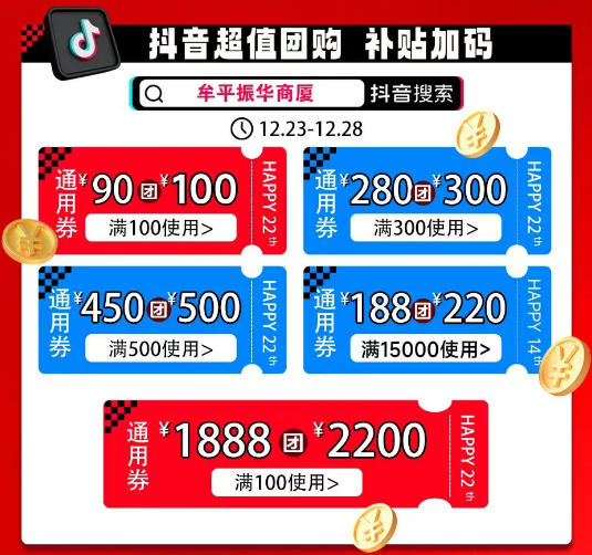 关注牟平振华商厦抖音账号,成为牟平振华商厦抖音粉丝,即可参与团券活动,享受折上再优惠。(个别品牌除外)
