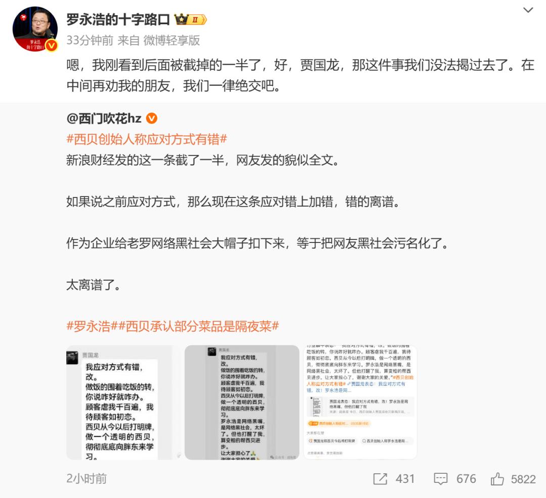 对于被西贝创始人贾国龙称为“网络黑嘴”、“网络黑社会”,罗永浩发文称“好,贾国龙,那这件事我们没法揭过去了。在中间再劝我的朋友,我们一律绝交吧”。