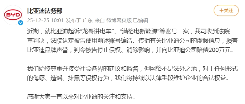 12月25日,比亚迪法务部官微发文表示,近期,就比亚迪起诉“龙哥讲电车”、“满格电新能源”等账号一案,该公司收到法院一审判决。法院认定被告使用前述账号编造、传播有关比亚迪公司的虚假信息,损害比亚迪商业信誉及商品声誉,判令被告停止侵权、消除影响,并向比亚迪公司赔偿 200 万元。