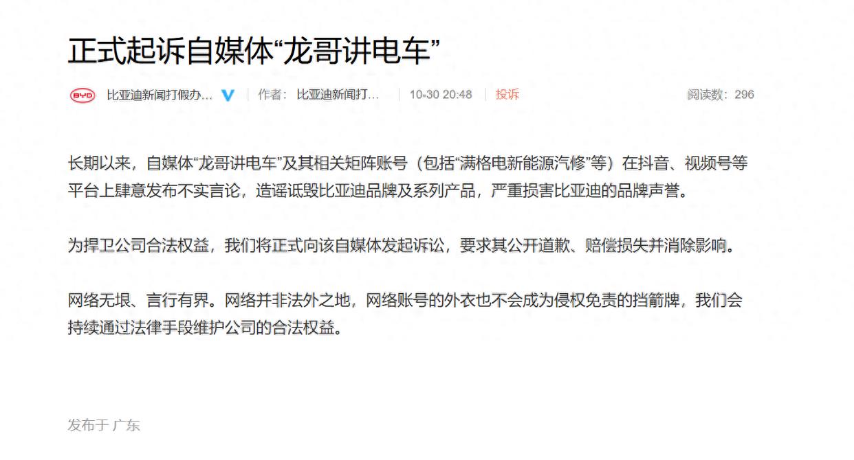 据红星新闻此前报道,比亚迪新闻打假办公室发文称,长期以来,自媒体“龙哥讲电车”及其相关矩阵账号(包括“满格电新能源汽修”等)在抖音、视频号等平台上肆意发布不实言论,造谣诋毁比亚迪品牌及系列产品,严重损害比亚迪的品牌声誉。为捍卫公司合法权益,公司将正式向该自媒体发起诉讼,要求其公开道歉、赔偿损失并消除影响。