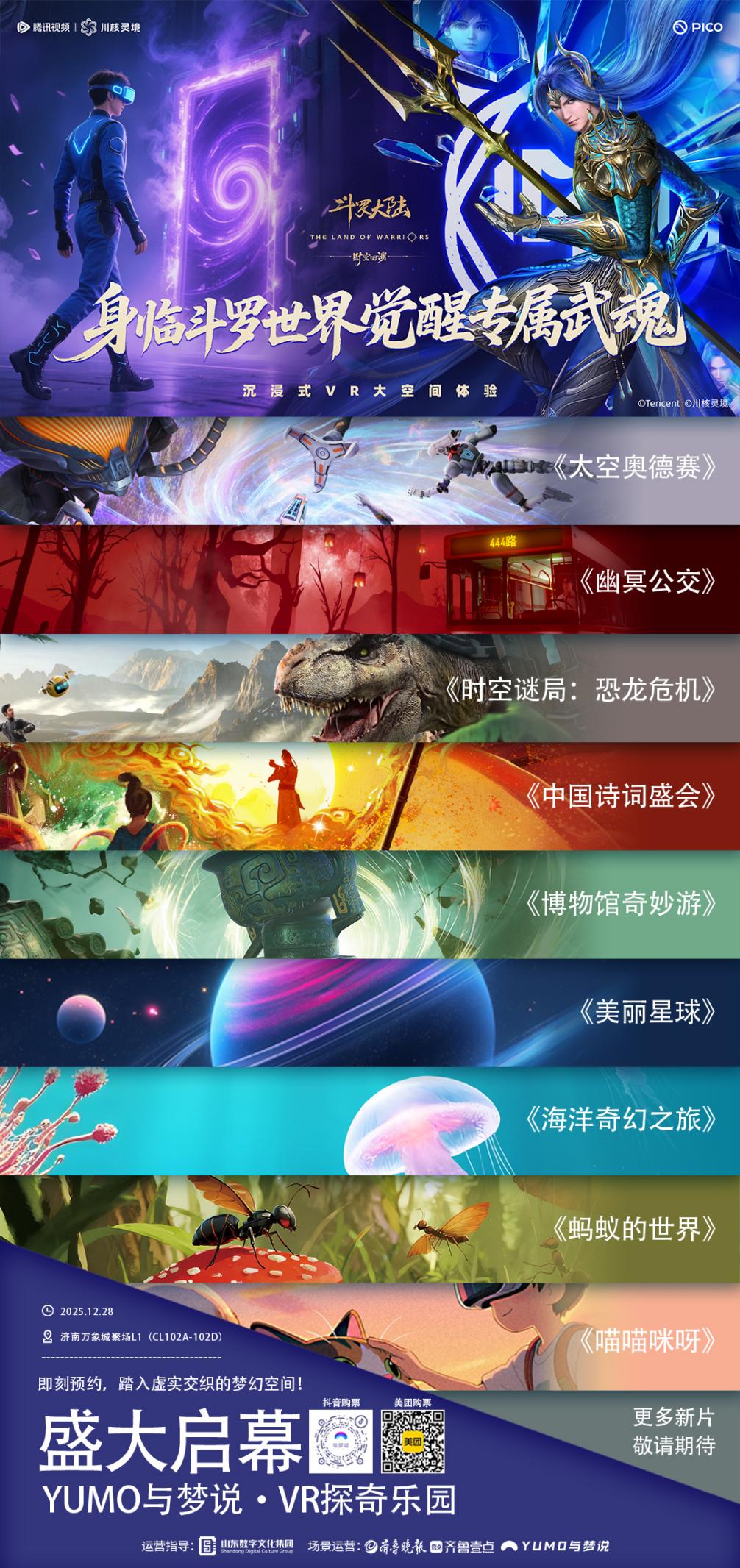 近日,山东数字文化集团旗下元梦・沉浸工作室全新推出的 “YUMO 与梦说・VR 探奇乐园”正式官宣:将于12月28日在济南万象城聚场L1层盛大启幕。作为深耕济南“东西双核”布局后的战略升级之作,这座面积超700平米的沉浸式娱乐空间,将以国漫现象级 IP《斗罗大陆》为核心,领衔10部跨风格VR影片矩阵,为省城消费者带来“挣脱屏幕、自由行走”的虚实共生体验。