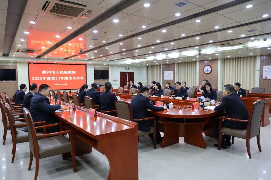 为深入学习贯彻习近平法治思想,切实提高领导干部运用法治思维和法治方式深化改革、推动发展、化解矛盾、应对风险的能力,12月25日,滕州市人民检察院召开2025年度部门专题述法会议。党组书记、检察长靖波出席会议并作总结讲评。院班子成员、各部门主要负责人参加会议。