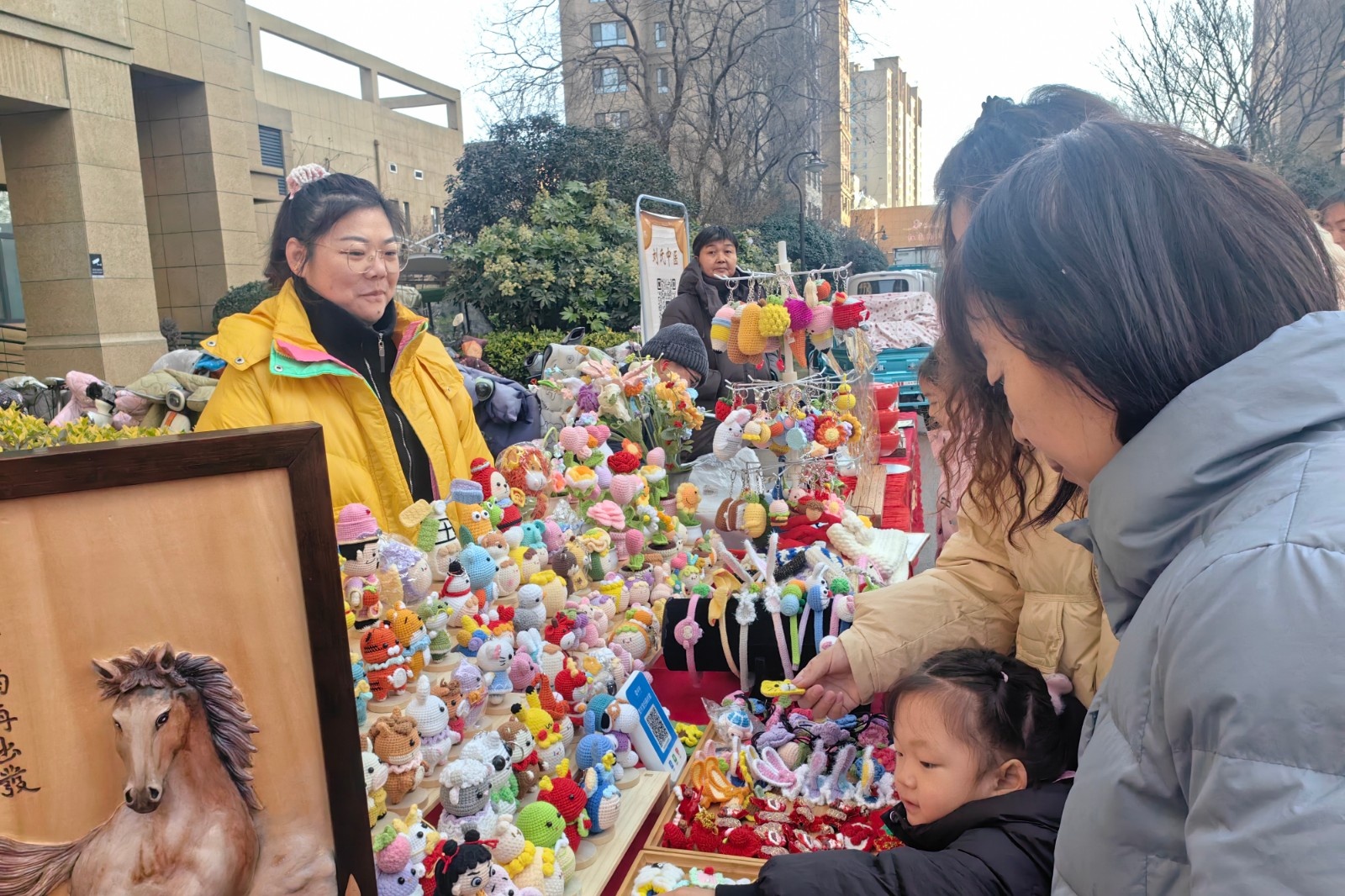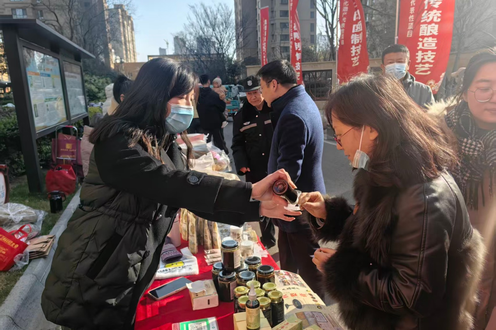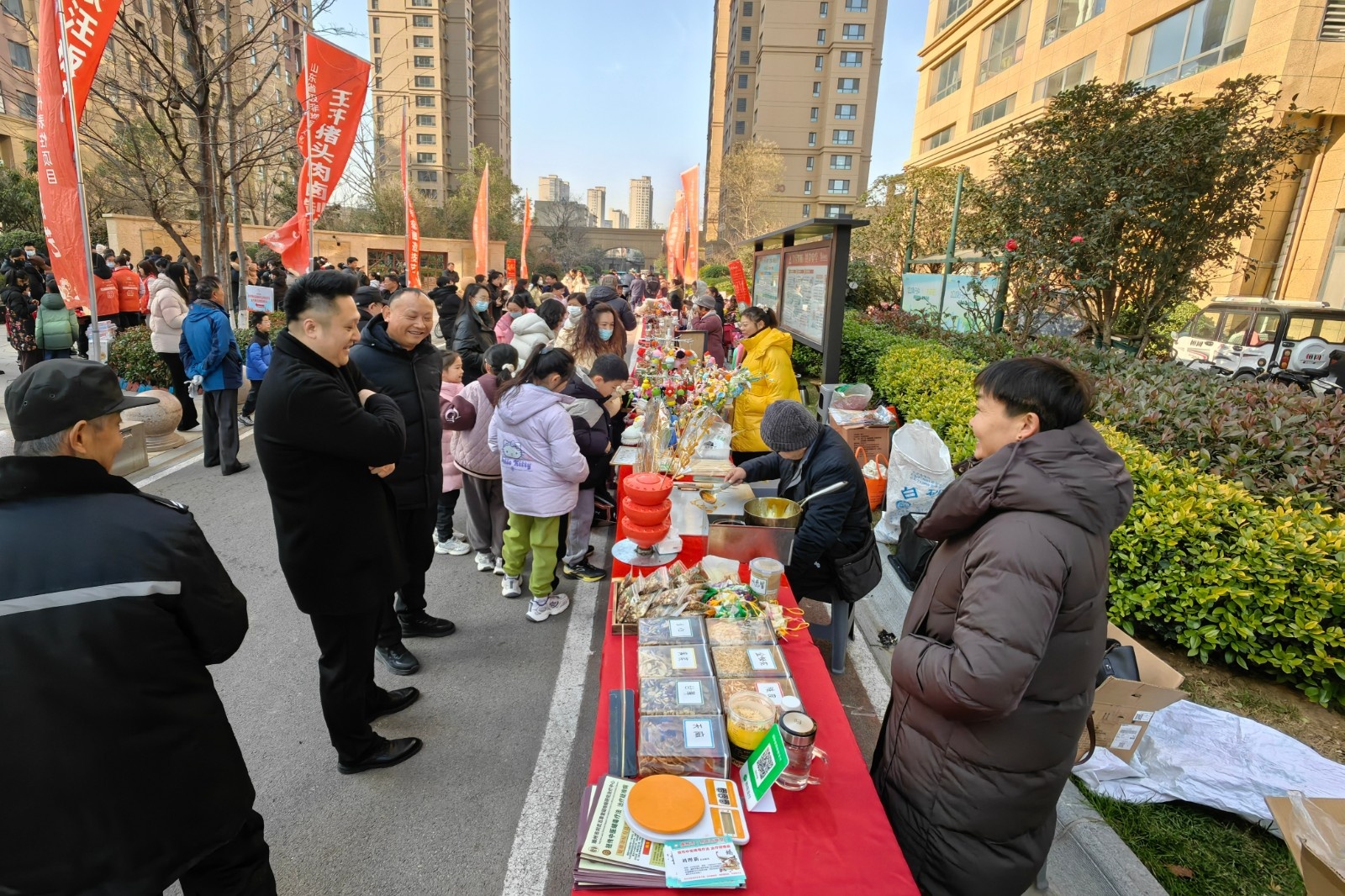 与运动区的活力四射相映成趣的,是一旁非遗文化展区的浓郁韵味。精美的面塑作品整齐陈列,花鸟鱼虫、生肖瑞兽等造型栩栩如生,引得孩子们驻足观赏,家长们趁机讲解面塑背后的民俗寓意,让传统文化在潜移默化中传承。鲁班锁摊位前,居民们饶有兴致地尝试拆解与拼装,在动手实践中感受传统榫卯工艺的精妙智慧。王开猪头肉、鼎盛酱油、张汪板鸭等滕州本土非遗食品更是香气四溢,大家驻足挑选、品尝,在舌尖上品味地道的家乡风味,沉浸式感受非遗文化的独特魅力。