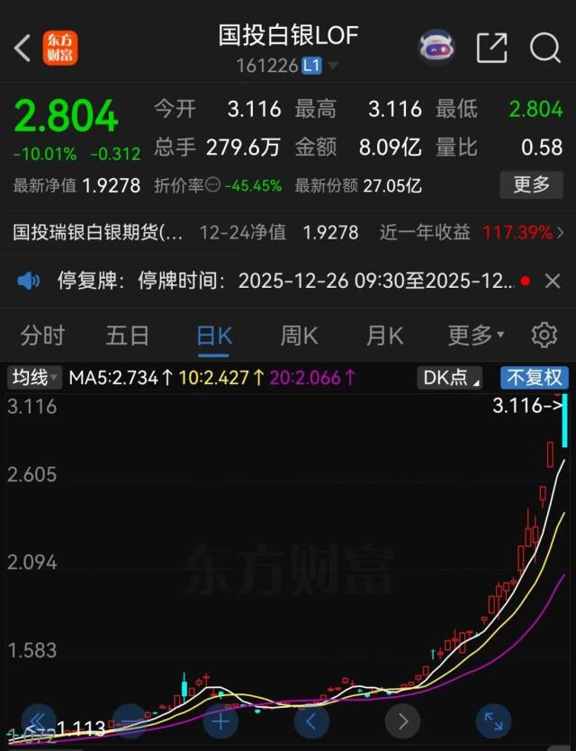 继昨日发布停牌1小时公告之后,国投白银LOF今日再度公告称,截至2025年12月25日,本基金二级市场的收盘价为2.804元,明显高于基金份额净值,投资者如果盲目投资于高溢价率的基金份额,可能面临较大损失。为保护投资者利益,本基金将于2025年12月26日开市起至当日10:30停牌,自2025年12月26日10:30复牌。