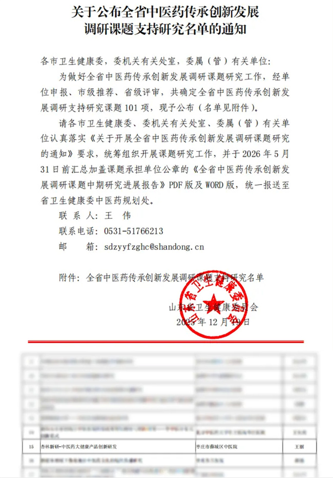 近日,山东省卫生健康委员会发布了《关于公布全省中医药传承创新发展调研课题支持研究名单的通知》,薛城区中医院申报的《杏林新研-中医药大健康产品创新研发》课题入选省级支持研究名单。