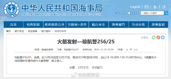 航行警告!南海部分海域进行火箭发射,禁止驶入央视军事 2025-12-25 22:17:00据中国海事局网站消息,清澜海事局发布航行警告,12月26日至12月27日,每日6时30分至8时30分,南海部分海域进行火箭发射,禁止驶入。 责任编辑:于春晖