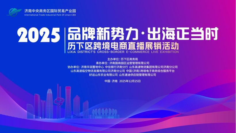 12月25日,“品牌新势力・出海正当时”2025历下区跨境电商直播展销活动,在济南中央商务区国际贸易产业园盛大启幕。本次活动由历下区商务局主办,济南国商园区运营管理有限公司承办,以双会场联动形式搭建跨境贸易实效平台,助力区域品牌借势“一带一路”倡议与数字贸易浪潮拓展国际市场。