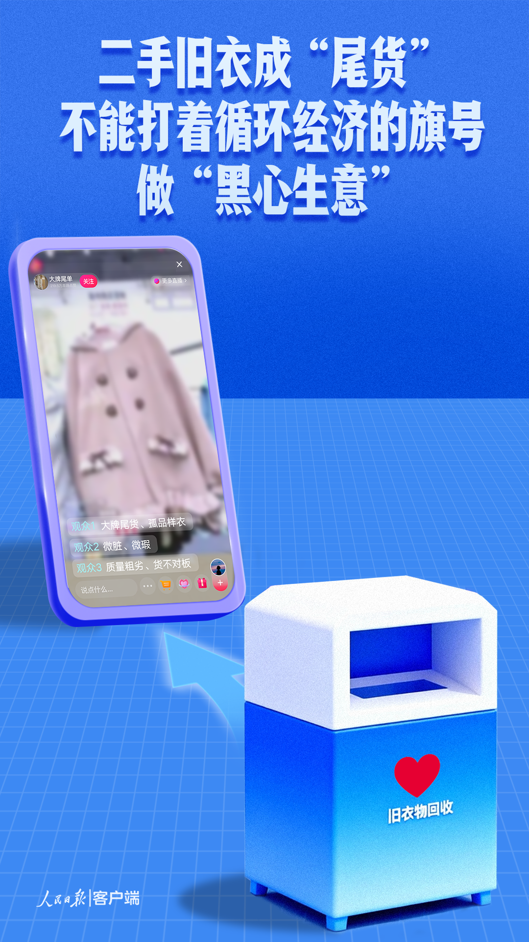 旧衣回收是循环经济的重要组成部分,既有环保价值也有公益属性。然而一些别有用心者却利用旧衣回收做起了“黑心生意”。标注“公益捐赠”“爱心募捐”的旧衣回收箱,甚至一些垃圾站,成了不良商家的“货源地”。这些旧衣物经过分拣,成色好的被“翻新”后挂吊牌当作新品售卖,其余则以“微瑕”“样衣”之名成吨转卖到线上直播间乃至线下实体店。商家用“孤品”“尾货”的话术掩盖二手旧货的真相,用“不退不换”的霸王条款堵住消费者的维权之路。
