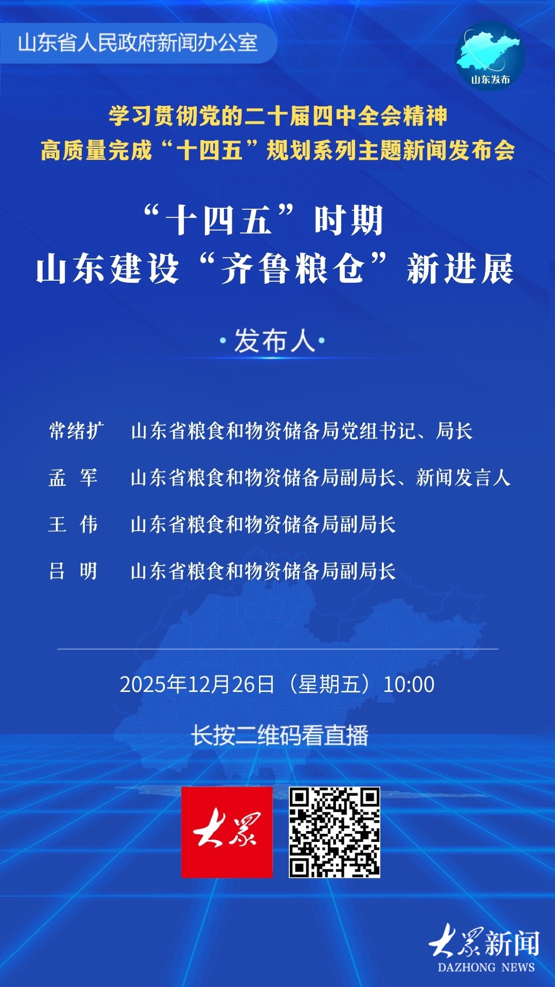 事关建设“齐鲁粮仓”!今天上午10时山东省政府将举行新闻发布会山东发布 | 2025-12-26 07:26:51 原创崔晗 高广超来源:大众新闻微信扫码扫码下载客户端省政府新闻办定于12月26日(周五)上午10:00举行新闻发布会,邀请省粮食和物资储备局主要负责同志等介绍“十四五”时期山东建设“齐鲁粮仓”新进展。(大众新闻记者 崔晗 高广超)责任编辑:周凡婷