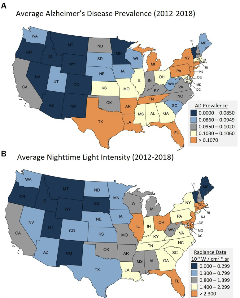 这项研究的科研人员把美国 48 个州的光污染情况和本地区的医疗记录进行了比对,令人惊讶的是,他们竟然发现光污染和阿尔兹海默症之间存在显著正相关,这种巧合也引起了科研人员的兴趣。