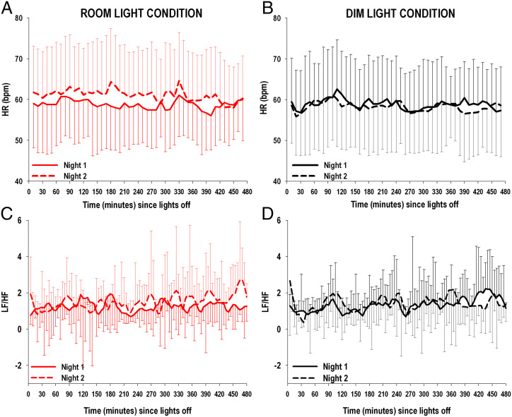 那么,光污染会怎么影响到我们的身体的呢?为了探究这个问题,研究人员把 20 名参与者分别安排在昏暗的房间以及开灯的房间中入眠,在夜间同步监测他们的心率。