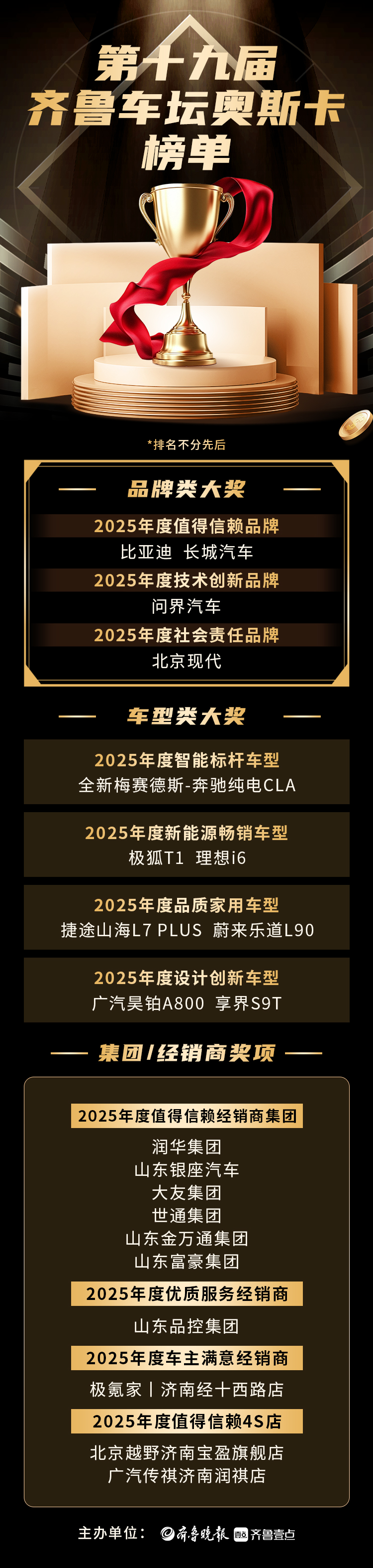 值此辞旧迎新之际,第19届齐鲁车坛奥斯卡正式拉开帷幕,再次以“风向标”的视角,为2025年山东汽车行业的卓越者加冕。自2005年首度启航,历经18载春秋沉淀,齐鲁车坛奥斯卡已成为山东地区最具权威性与影响力的汽车行业盛会,不仅是对年度优秀品牌的致敬,更是对汽车产业发展方向的前瞻洞察。本届评选聚焦行业新趋势、消费新需求,精心设置“年度品牌”“年度车型”“年度经销商/集团”三大类别奖项,经过多轮专业评审与市场验证,最终获奖名单正式揭晓(排名不分先后):